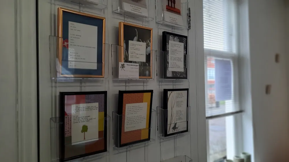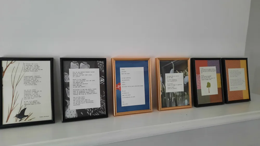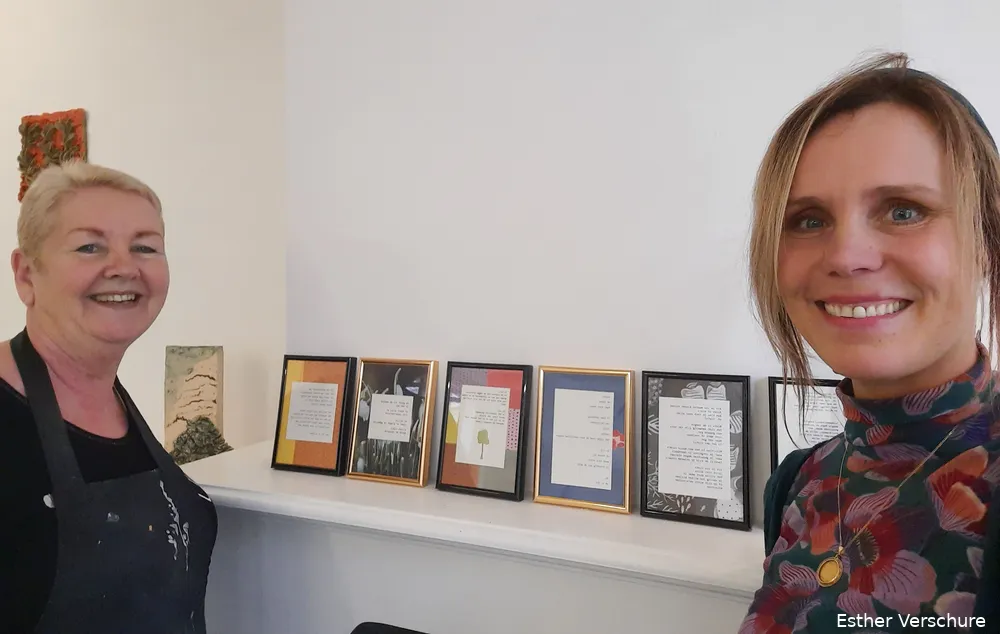 Toen Esther Verschure met haar poëzie op haar pad kwam, vonden zij samen direct een verbinding. Er werd een samenwerking aangegaan voor één jaar, waarbij Esther gedichten schreef die te zien waren aan het atelierraam van Corine. Inmiddels is dat jaar voorbij, maar de samenwerking zetten zij voort.