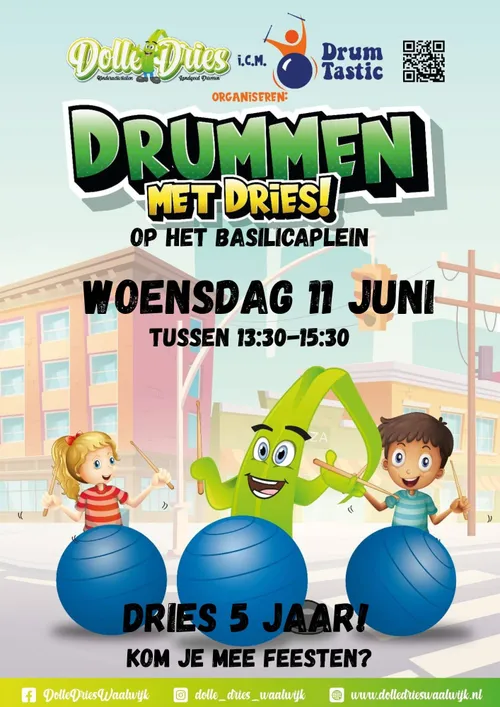 Drumtastic worden kinderen tussen 13:30 en 15:30 uur uitgenodigd om mee te komen drummen met mascotte Dries.