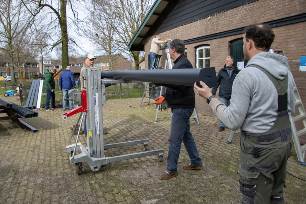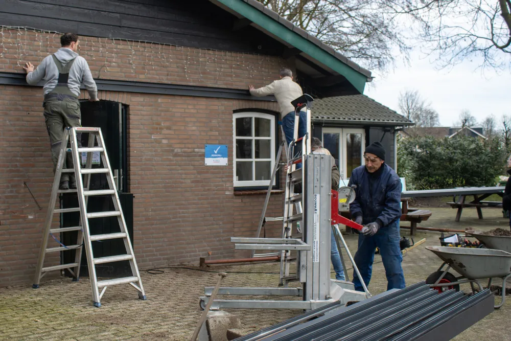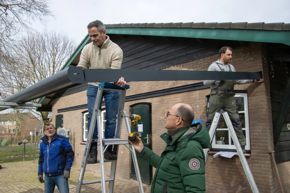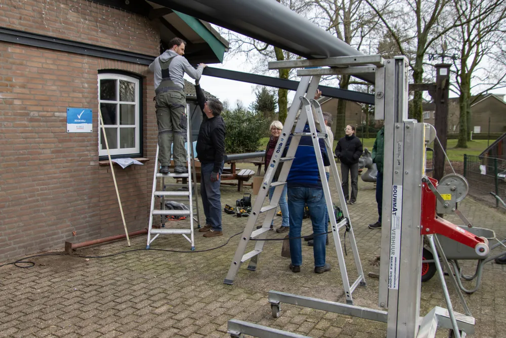 Vandaag is er, in kader van NLdoet, hard gewerkt aan een enorme overkapping aan de voorzijde van de boerderij. Uitgerekend vandaag was het de mooiste, droogste en zonnigste dag sinds tijden. De overkapping is net zo breed als de boerderij zelf, is 3,5 meter diep en heeft een lichtdoorlatend dak. En wat helemaal mooi is: de overkapping is voor de volle 100% bekostigd met gulle gaven (in geld en handjes) van een aantal vrienden van ‘t Erf.