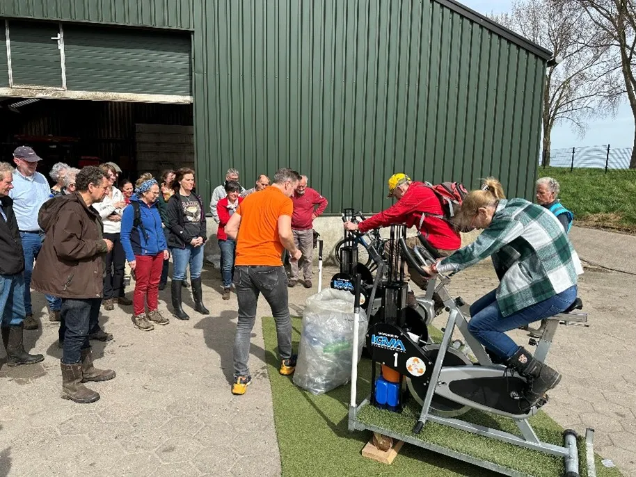 Rond half één kwamen alle vrijwilligers weer samen op het verzamelpunt om te genieten van een verse kop koffie met een broodje. Na afloop kregen ze een demonstratie van "Van Pet Naar Pret", waarbij plastic vermalen werd door middel van fietsen. Een flinke aanhangwagen kon ternauwernood al het verzamelde afval meenemen, dat op een veilige plek werd opgeslagen om later door Rijkswaterstaat te worden opgehaald.