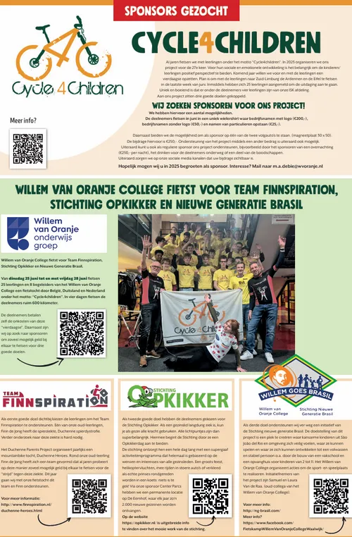 WAALWIJK – Van dinsdag 24 juni tot en met vrijdag 27 juni stappen 26 leerlingen en 6 begeleiders van het Willem van Oranje College op de racefiets voor een bijzondere uitdaging. In vier dagen tijd fietsen zij meer dan 600 kilometer door Nederland, België en Duitsland. De tocht maakt deel uit van het schoolproject Cycle4Children, waarbij burgerschap, sport en verantwoordelijkheid samenkomen.