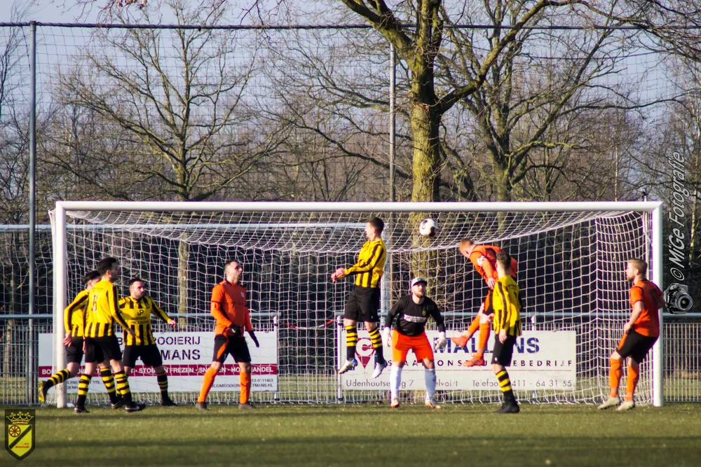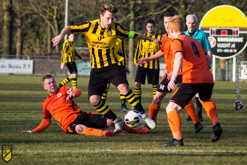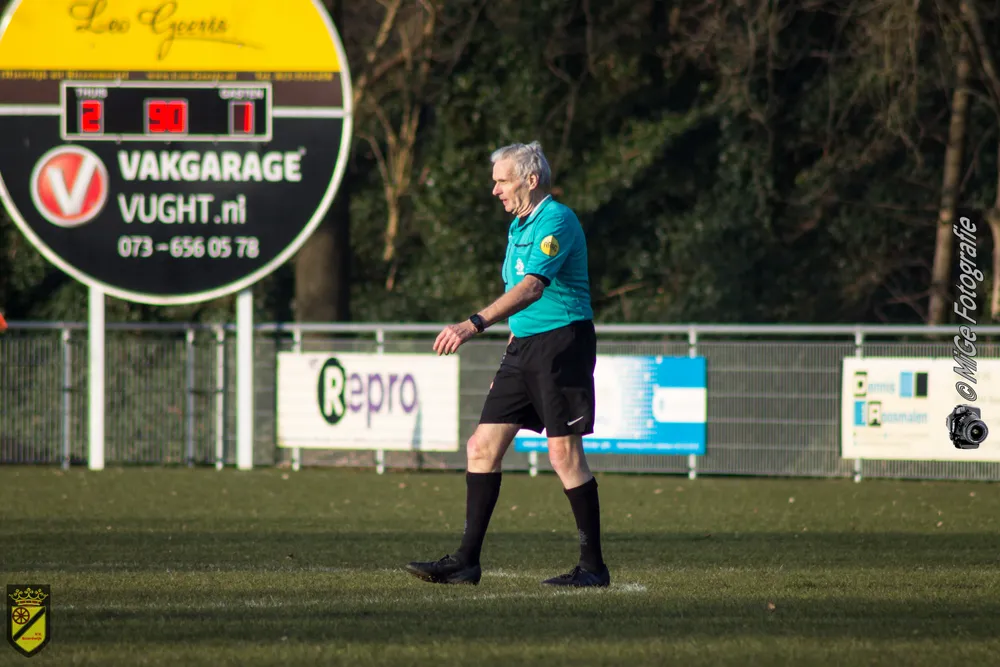 Vanaf het begin van de wedstrijd golft het spel op en neer van het ene doel naar het andere doel, de enige die het hele veld bestrijkt is de bijna 69-jarige scheidsrechter Antoon Fitters. Veel kansen levert het niet op, het enige dat vermeldenswaardig is het geplaatste schot van Delano Boezer, dat goed verwerkt wordt tot corner door de keeper van VCB. Na 45 minuten spelen op Sportpark Biezenmortel in een heerlijk Winterzonnetje breekt de rust aan. Gezelligheid voor en in de kantine van VCB. Ruststand 0-0