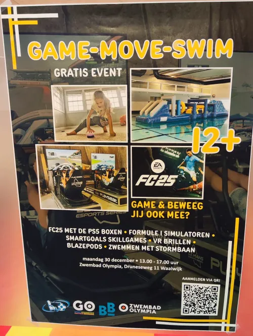 WAALWIJK - Ben jij 12 jaar of ouder en hou je van gamen, sporten en zwemmen? Kom dan op maandag 30 december naar het spectaculaire Game-Move-Swim event in Zwembad Olympia, gelegen aan de Drunenseweg 11 in Waalwijk. Dit gratis evenement biedt een perfecte combinatie van ontspanning en actie!