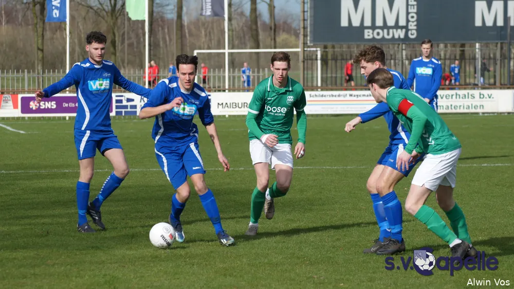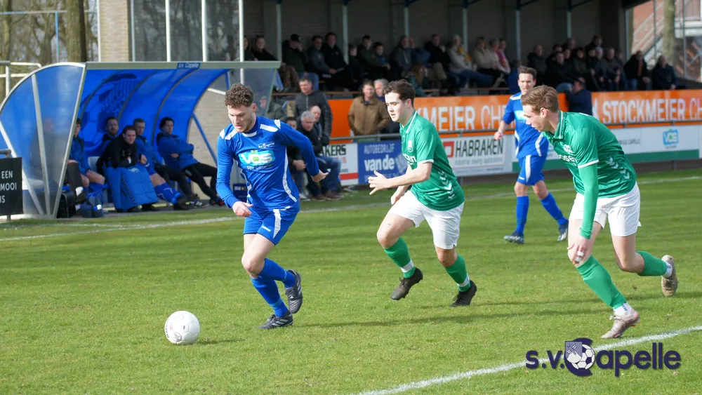 In de eerste helft enkele kansen voor beide doelen, maar de 0-0 bleef lang staan tot kort voor rust. S.V. Capelle leed balverlies en hieruit belandde de bal bij Jordy Swanen, die met een schot van lange afstand de bezoekers op 0-1 bracht.