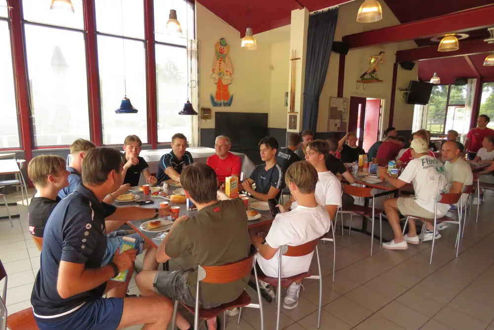 Ondanks de tropische temperaturen werd keihard gewerkt en dat was nodig want er is best nogal wat werk aan de winkel om er voor te zorgen dat 24 september bij de eerste competitiewedstrijd iedereen wedstrijdfit is. Na de training werd in het clubhuis gezamenlijk de lunch gebruikt. In de middag steeg de temperatuur ver over de 30 graden, reden waarom de middagtraining noodgedwongen moest worden afgelast.