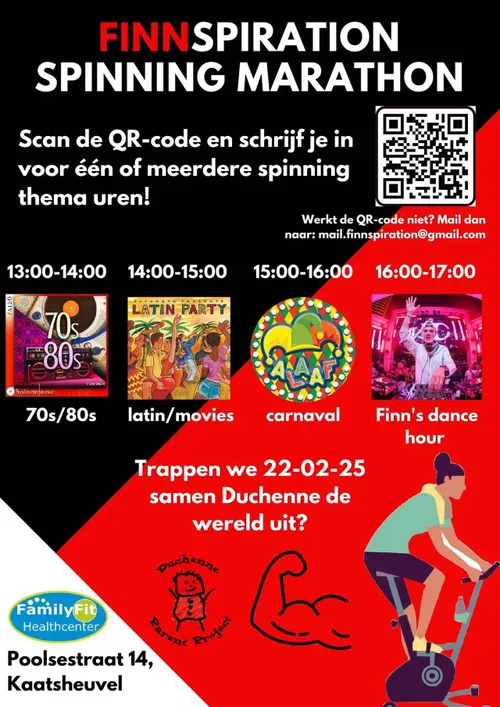 KAATSHEUVEL – Op zaterdag 22 februari organiseert team Finnspiration in samenwerking met Family Fit Healthcenter een vier uur durende spinningmarathon om geld in te zamelen voor onderzoek naar Duchenne Spierdystrofie. De opbrengst gaat volledig naar het Duchenne Parent Project.