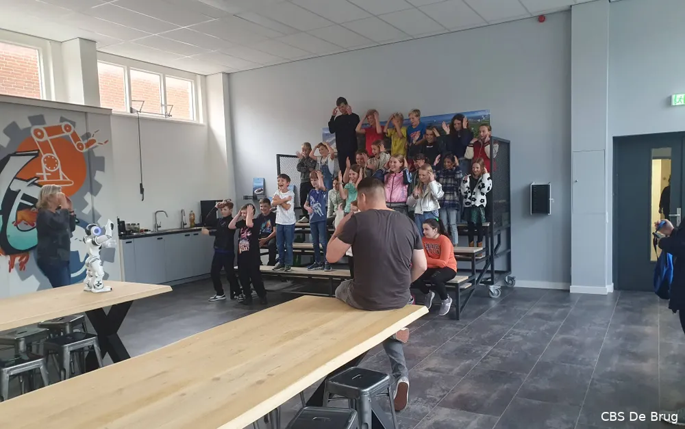 De leerlingen werden welkom geheten door Hanzie, een echte robot, die ze uitdaagde de macarena samen te dansen. Prachtig vonden ze het en het enthousiasme voor de TechXperiences was voelbaar.