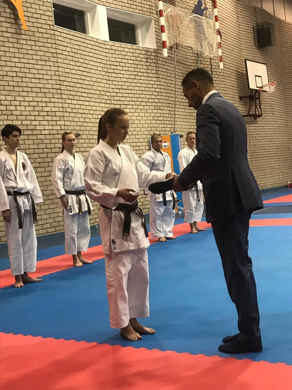 Demi Schoenmakers uit Kaatsheuvel ging als eerste 13-jarige karateka tussen de volwassenen op voor haar zwarte band 1ste dan. Hiermee is ze momenteel de jongste karateka van Nederland met zwarte band. Gedurende een uur werden de karateka`s op 4 onderdelen getest te weten Kihon (basis vaardigheden), Kata (schijngevecht), Kumite (gevechtstechnieken met partner) en Jiyu Kumite ( vrijgevecht ). Demi kreeg uit handen van de voorzitter van de KBN het eerste jeugddiploma en band overhandigd.