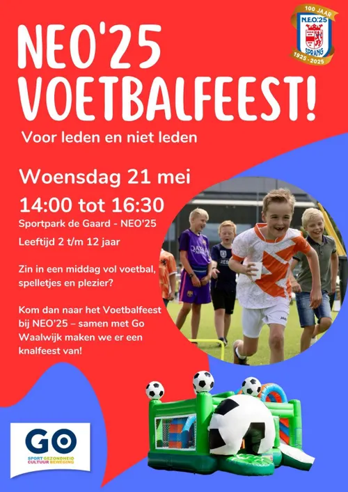 WAALWIJK – In het jaar waarin voetbalvereniging NEO’25 haar 100-jarig jubileum viert, organiseert de club een bruisend voetbalfeest op woensdag 21 mei. Tussen 14:00 en 16:30 uur zijn alle kinderen van 2 t/m 12 jaar – zowel leden als niet-leden – welkom op Sportpark De Gaard voor een middag vol voetbal, spelletjes en plezier.