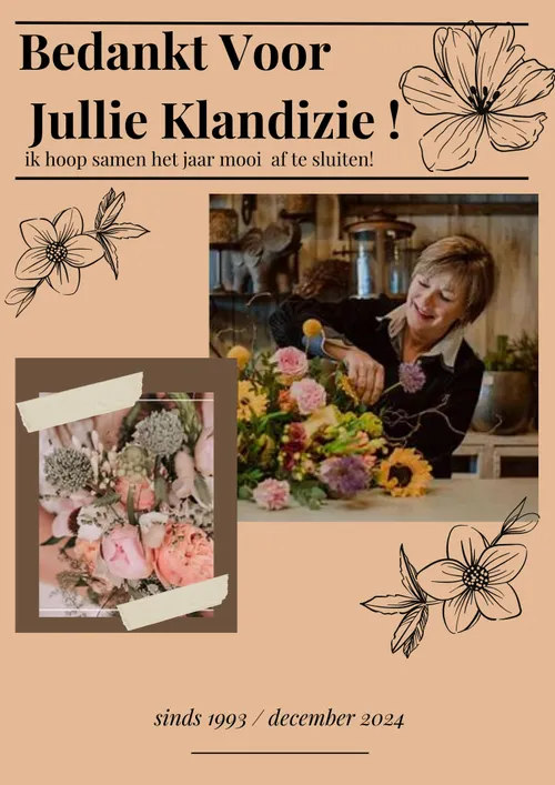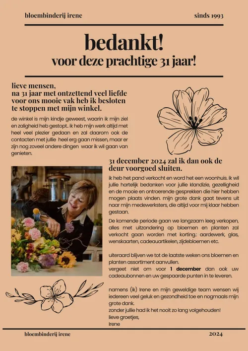 Op 31 december 2024 zal de winkel definitief dichtgaan. In de aanloop naar de sluiting zal de winkel geleidelijk worden leegverkocht met kortingen op aardewerk, glaswerk, wenskaarten, cadeauartikelen, zijdebloemen, en meer (met uitzondering van bloemen en planten). Hieronder volgt haar bericht.